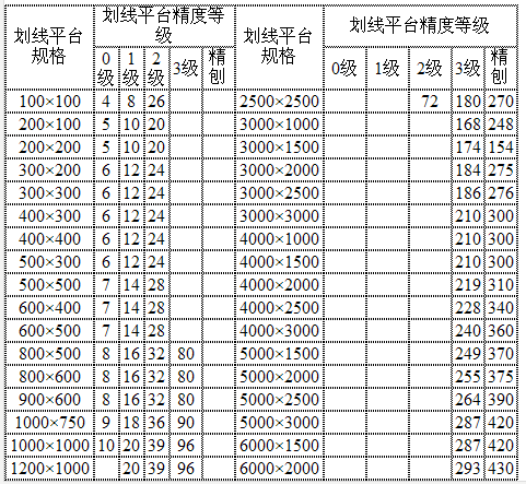 劃線平臺(tái)精度:按國(guó)家標(biāo)準(zhǔn)計(jì)量檢定規(guī)程執(zhí)行,分別為0、1、2、3四個(gè)等級(jí)。