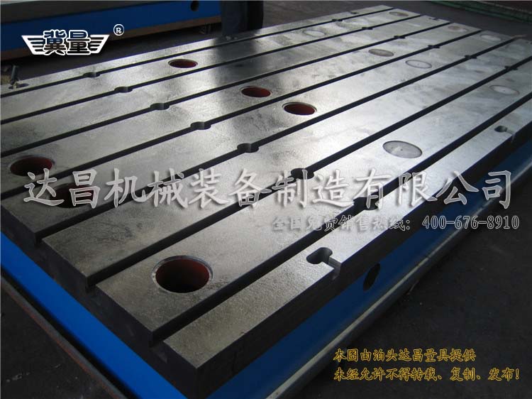 鑄鐵平臺是一種采用HT200材質(zhì)鑄造而成的基準(zhǔn)量具,在鉗工裝配、工人劃線、檢驗檢測、焊工焊接等工作中都能用到。鑄鐵平臺精度分為精刨、3級、2級、1級,精刨平臺適用于各種焊接工作,3級適用于裝配工作,2級適用于劃線工作,1級適用于檢測工作。一般情況下小于600*900的鑄鐵平臺精度能做到1級,小于1500*2000的鑄鐵平臺可以做到2級,再大規(guī)格為3級精度,而太大規(guī)格的只能到3級精度。在焊接工作中精刨的鑄鐵平臺更為適用,因為精刨的平臺工作面是沒經(jīng)過鏟刮,而是做了去刀紋處理,在焊接時不容易粘焊渣。鑄鐵平臺的加工工藝也分幾種,常見的加工方法就是人工刮研,刮研時工人通過量具找出平臺的高低點,然后進行鏟刮,刮研的鑄鐵平臺工作面是帶有鏟刮時留下的刀花的;再就是人工研磨,人工研磨是工人通過工具找出鑄鐵平臺的高低點,然后用研具進行研磨,研磨的鑄鐵平臺工作面是平滑的;像國外的客戶做的鑄鐵平臺很多都是要求數(shù)控加工的,數(shù)控加工的精度比其它兩種加工方法的精度低,但是光潔度高。達昌機械生產(chǎn)的鑄鐵平臺,精度穩(wěn)定不易磨損,抗拉強度也很強,抗拉強度是鋼的3-4倍。